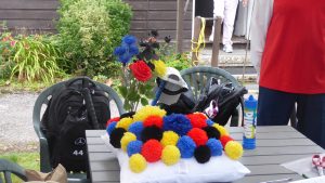 As an incentive we offered a bottle of wine for the best costume. Because of the very tight time schedule set for the event, we had encouraged teams to set up a clearly marked base under the trees so that opponents could easily find one another well before a game started and sort out the handicap details. This had worked extremely well, but we had noticed that that the base markings, without any prompt from the management, had got more and more elaborate. So now, under the carnival umbrella, we have a competition for the best dressed base.